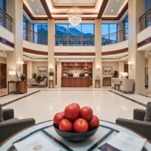 As I stepped into the grand lobby of Mountain View Hotel, my eyes were immediately drawn to the towering chandelier hanging overhead, casting a radiant